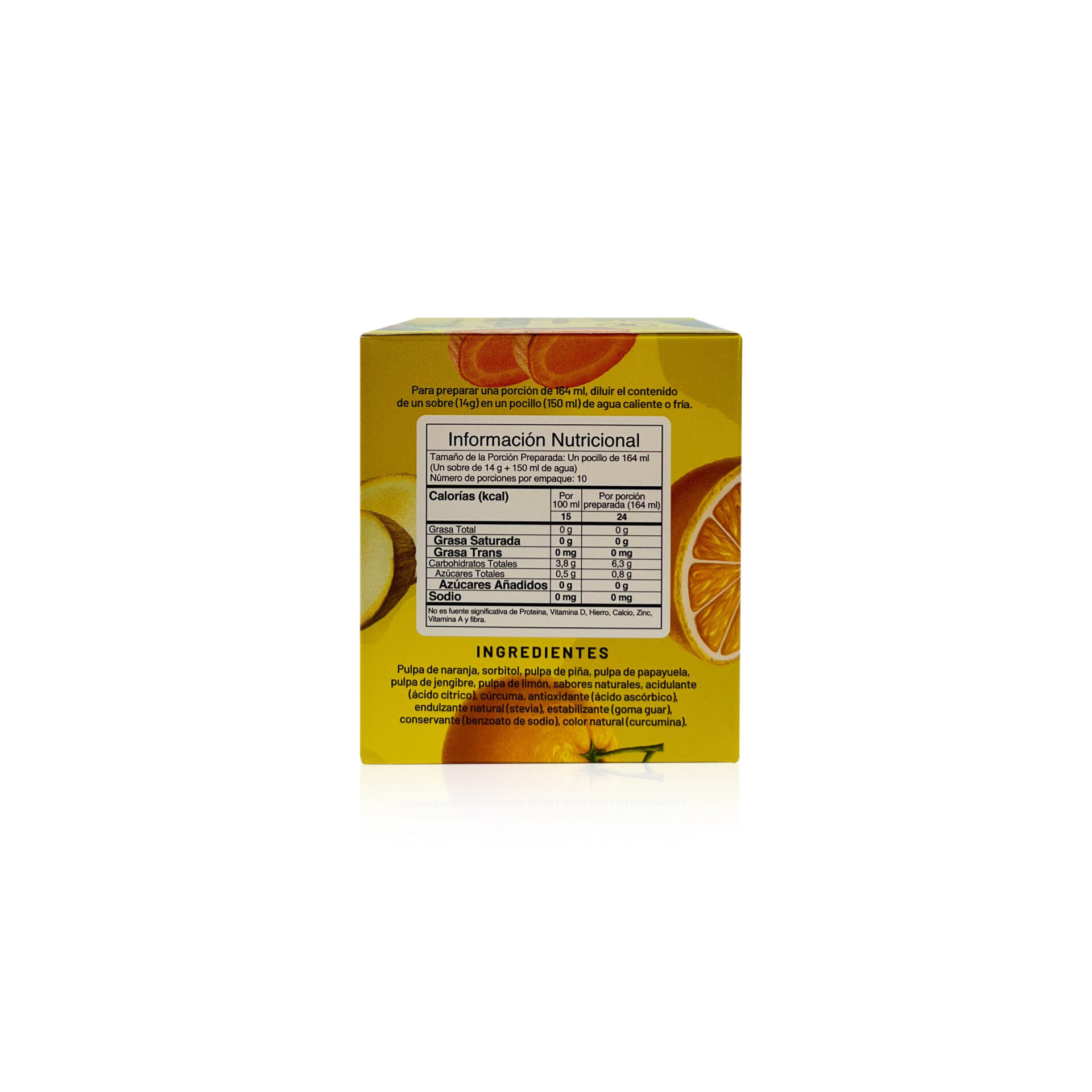 | Ingredientes | Pulpa de naranja, sorbitol, pulpa de piña, pulpa de papayuela, pulpa de jengibre, pulpa de limón, sabores naturales, acidulante (ácido cítrico), cúrcuma, antioxidante (ácido ascórbico), endulzante natural (stevia), estabilizante (goma guar), conservante (benzoato de sodio), color natural (curcumina). |
